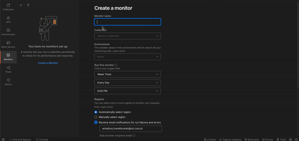 Enter the monitor name, select the collection, the environment (if you use variables), frequency of calls, and who to notify about fails.